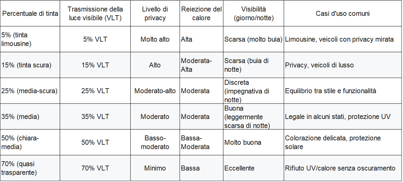 Viaggiando in autostrada in una torrida giornata estiva, gli interni della tua auto sono freschi e protetti dall’incessante riverbero del sole, mantenendo al contempo una visibilità cristallina e un look elegante e raffinato. Ma con termini come VLT, UVR e pellicole ceramiche o in carbonio che circolano ovunque, scegliere la giusta pellicola oscurante per i finestrini può sembrare come decifrare un linguaggio segreto. In questa guida, faremo chiarezza sul gergo e ti forniremo tutto ciò di cui hai bisogno per trasformare la tua auto in un’oasi di comfort, privacy e protezione.
